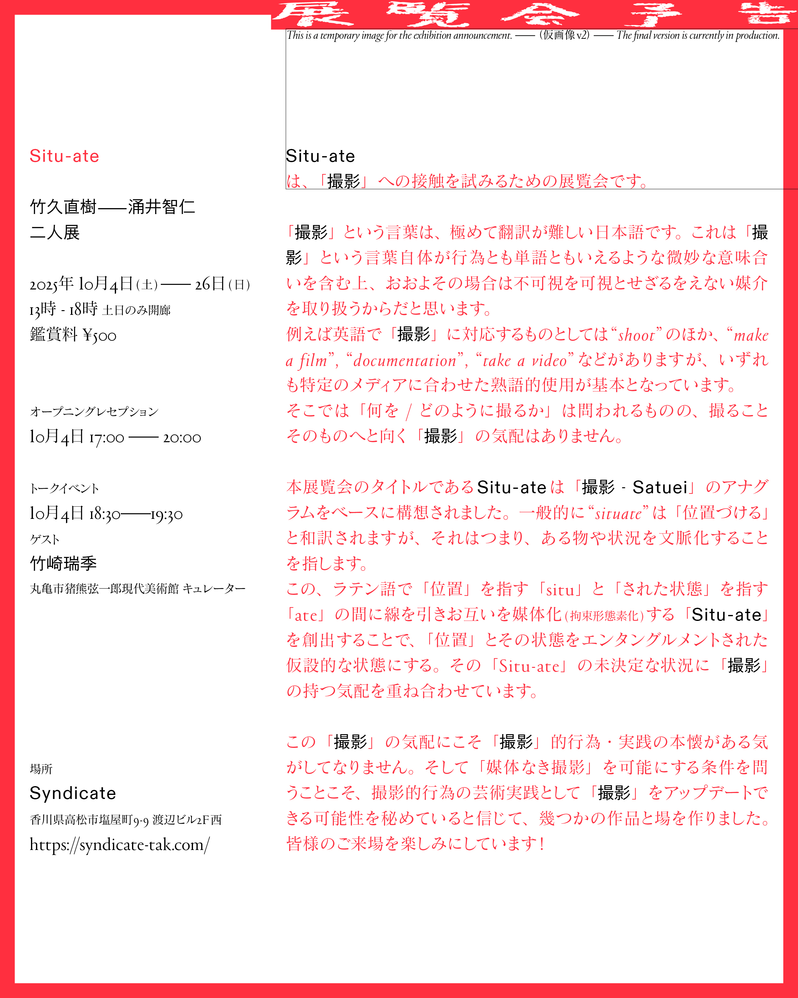 2025年10月4日(土)から10月26日 (日)まで、Syndicate にて竹久直樹、涌井智仁による二人展「Situ-ate」を開催します。